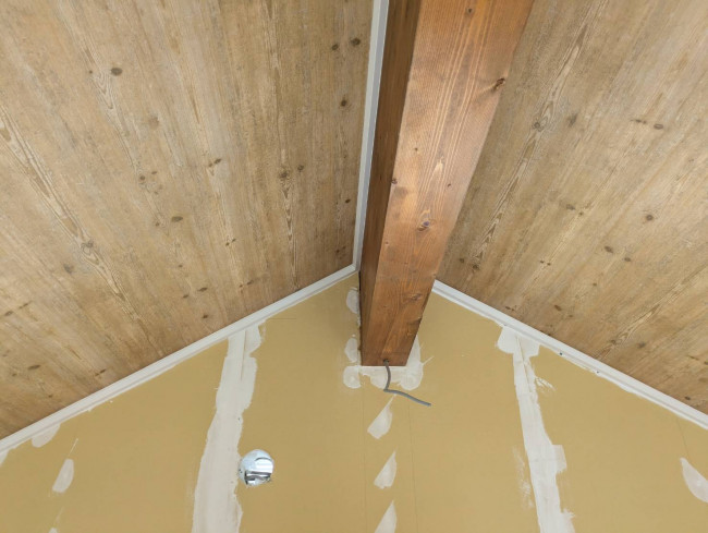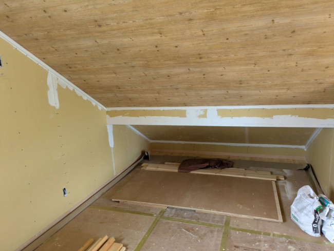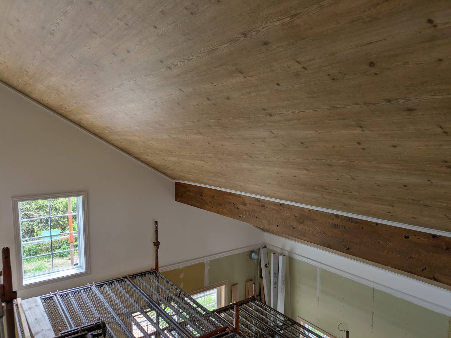 新築やリフォーム中の建物では、特に天井が高い場合、作業を安全に行うために足場が非常に重要です。今回も、高さによる危険を考慮し、安全に作業が進められるように室内にしっかりと足場をかけていました。