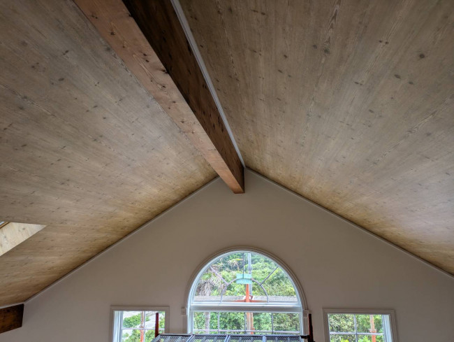 千葉県館山市にある現場では、今日は室内の吹き抜け部分の足場を解体しています。