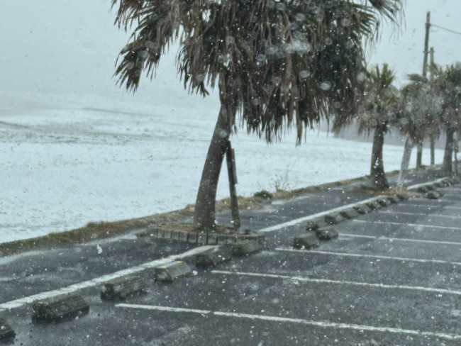 御宿海岸も普段とは違った顔を見せており、波打ち際にほのかに積もった雪が、白いレースのように砂浜を縁取っていました。