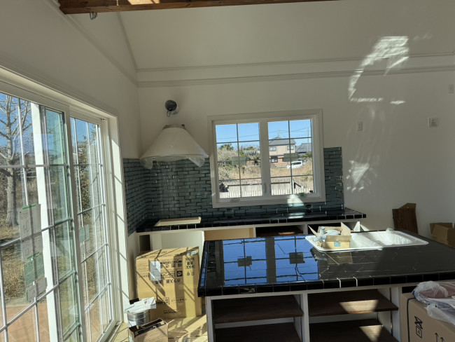 ハンドメイドのキッチンに丁寧にタイルが貼られ、その美しさが一層引き立っています。
