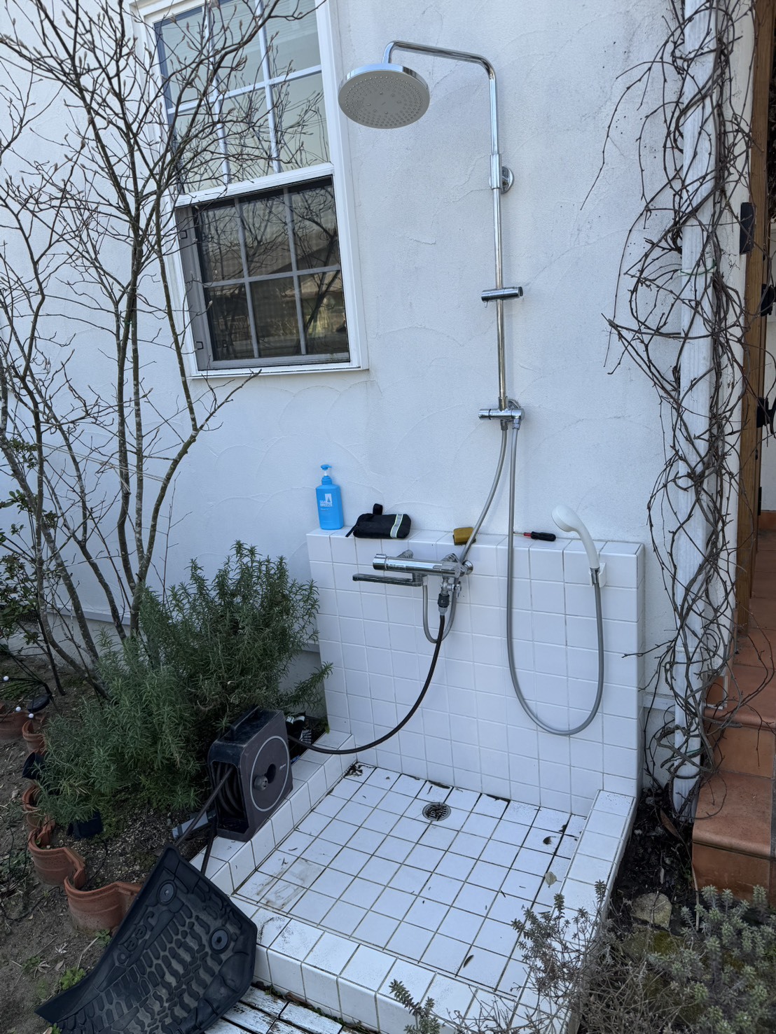 1月に凍結のために壊れてしまった外のシャワー水栓を交換する為です。