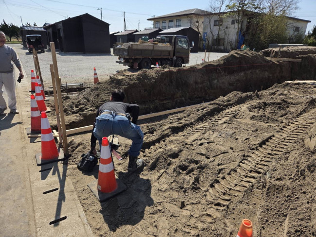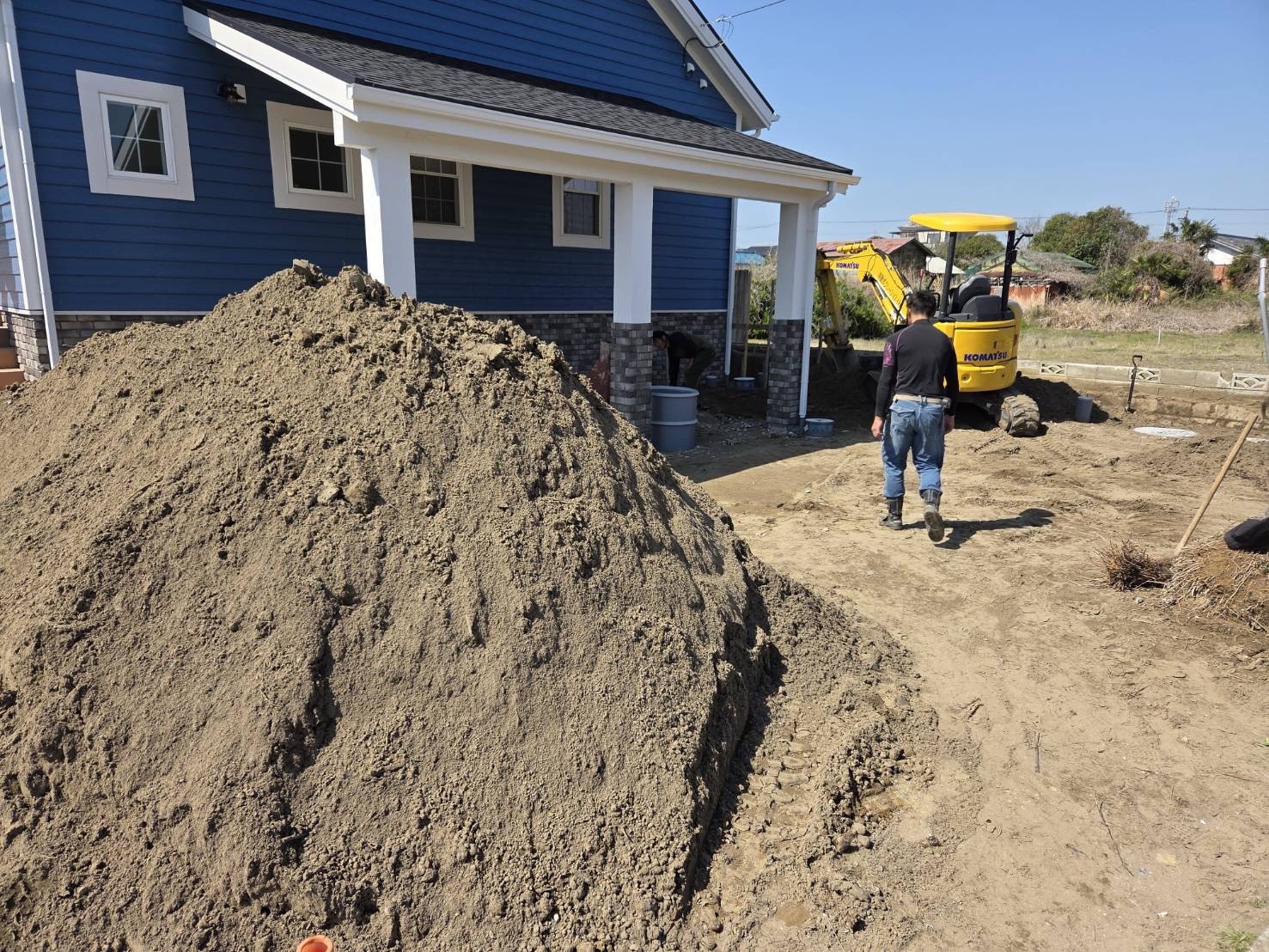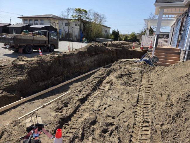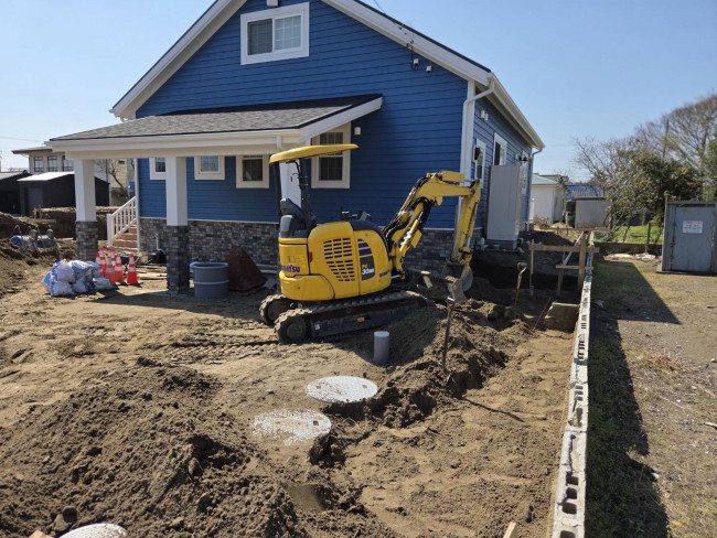 現在、先月に秘密の完成見学会を行った千葉県長生郡白子町にあるサーファー邸アメリカンタイプの家で外構工事が進行中です。