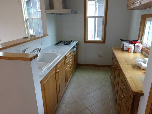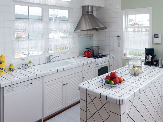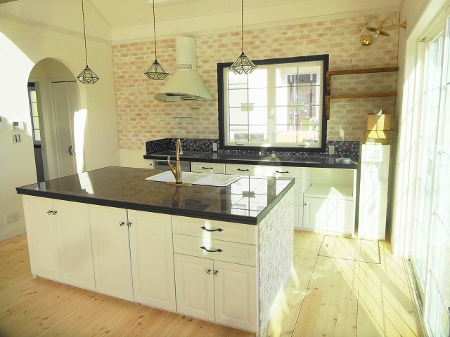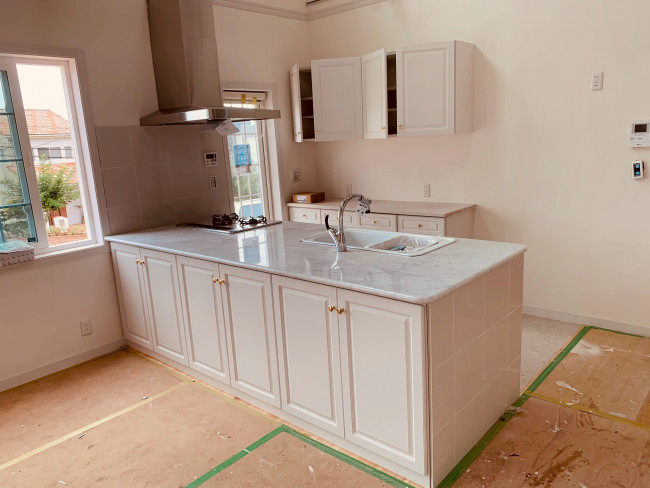 キッチンカウンターにはスペインタイルや本物の大理石、人工大理石を使用し、シンクと水栓はアメリカの高品質メーカーであるコーラー社のものを採用していました。