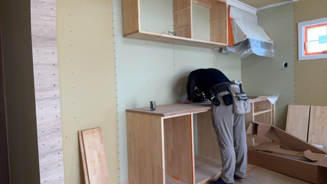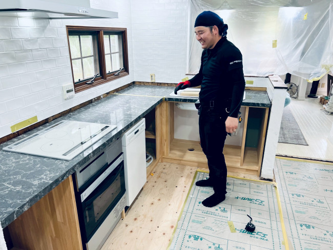 谷君も現場で、シンクを正確に収めるための穴開け作業を進めていました。