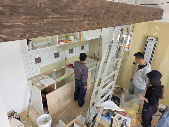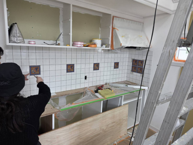 本日は、タイル職人の関さんとともに、キッチンのタイルの配置について打ち合わせを行いました。