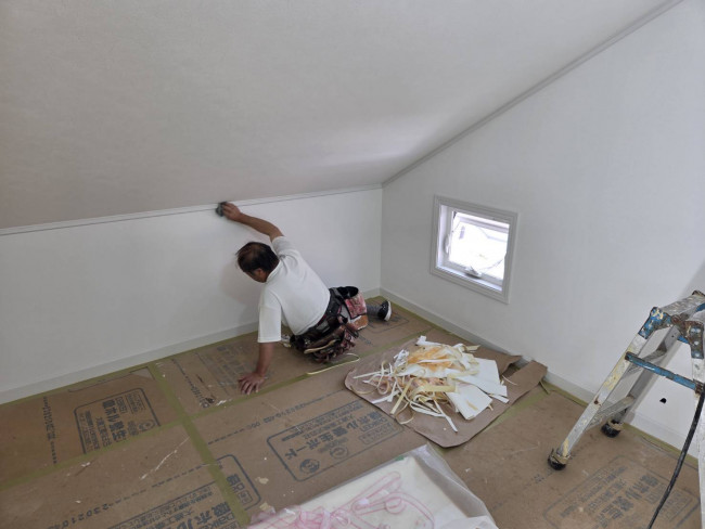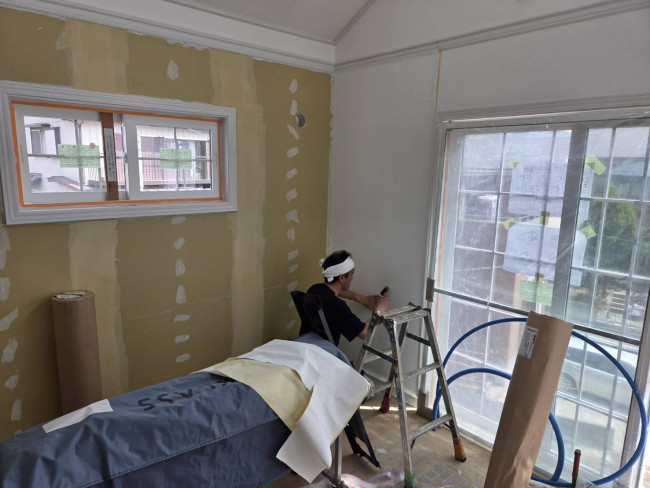 また、室内ではクロス職人も入り、壁紙の施工が進行中です。
