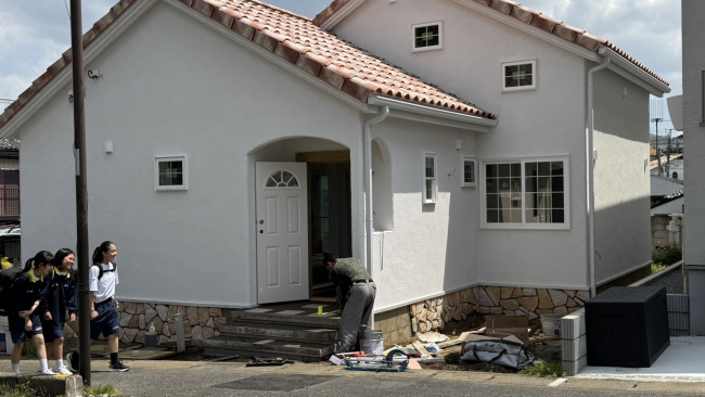 松戸市に建築の南欧スタイルの家の前に有限会社つるおか工務店の看板置いてます。